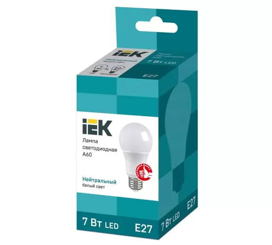 Технические характеристики IEK LED, A60, 7вт, 230В, 4000К, E27 LLE-A60-7-230-40-E27